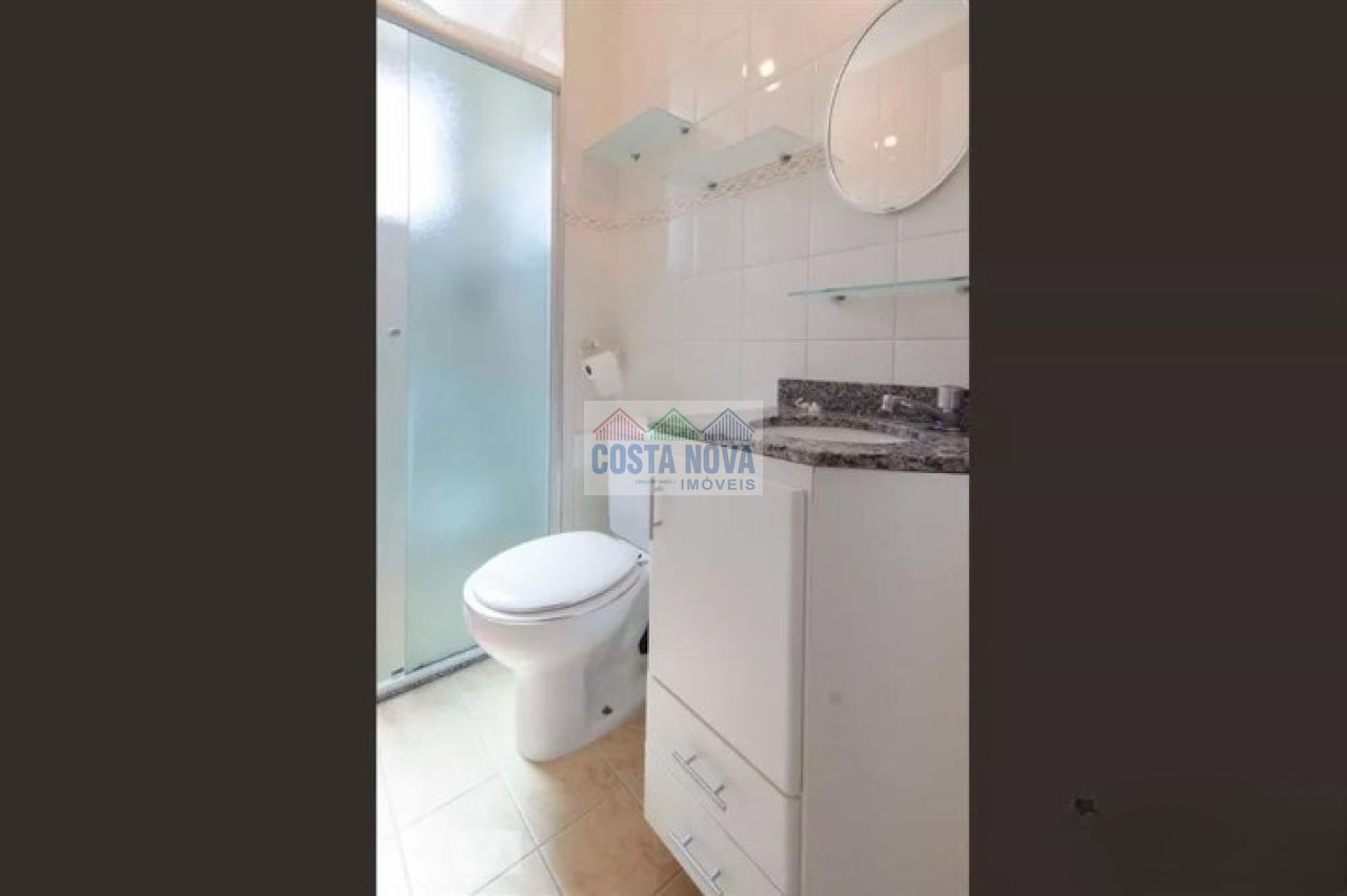 O hall do banheiro possui armários, trazendo mais espaço de armazenamento. O banheiro é moderno, com bancada em granito, gabinete, espelho, box em vidro temperado e chuveiro.