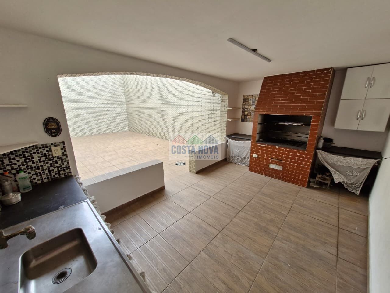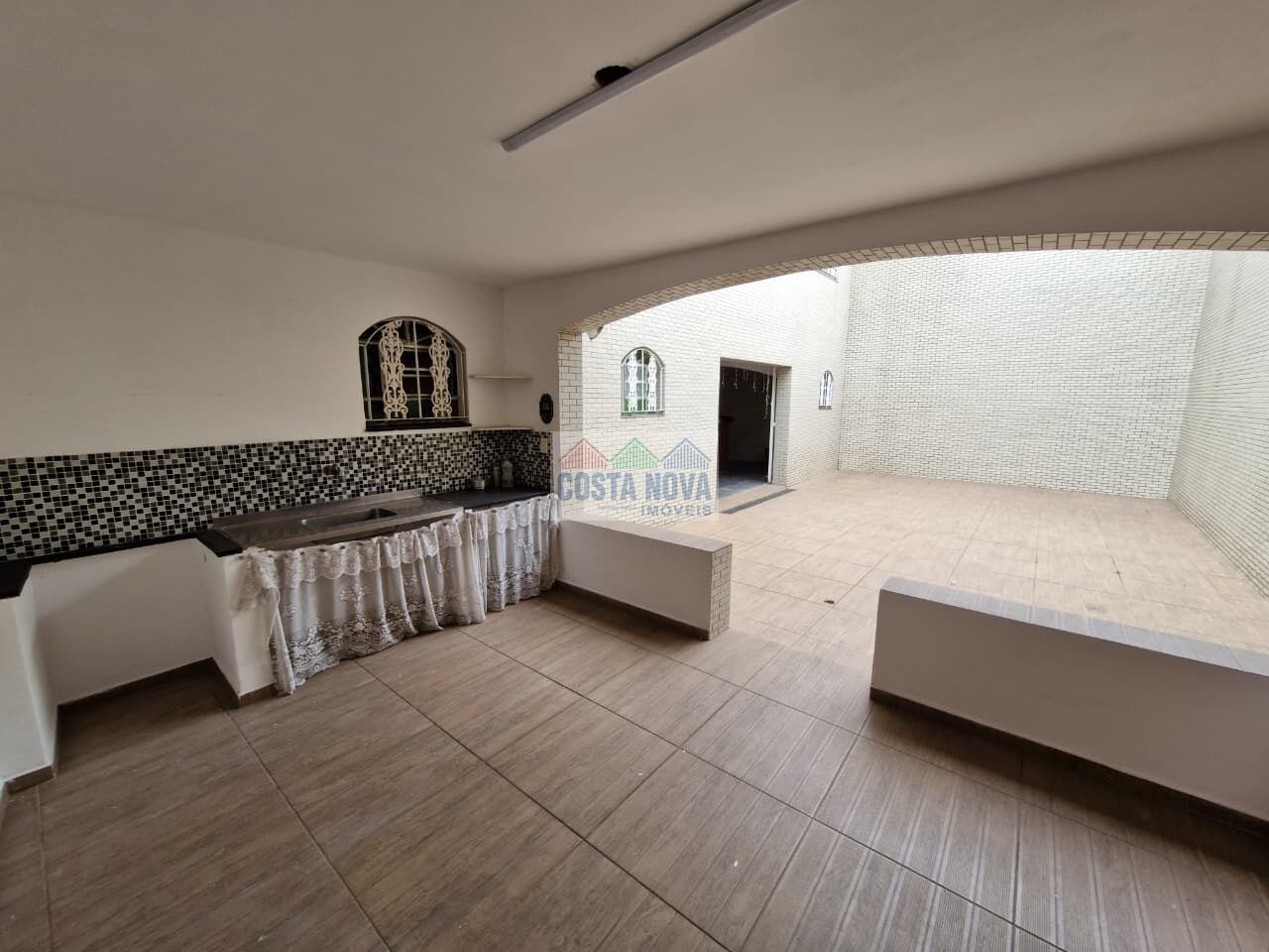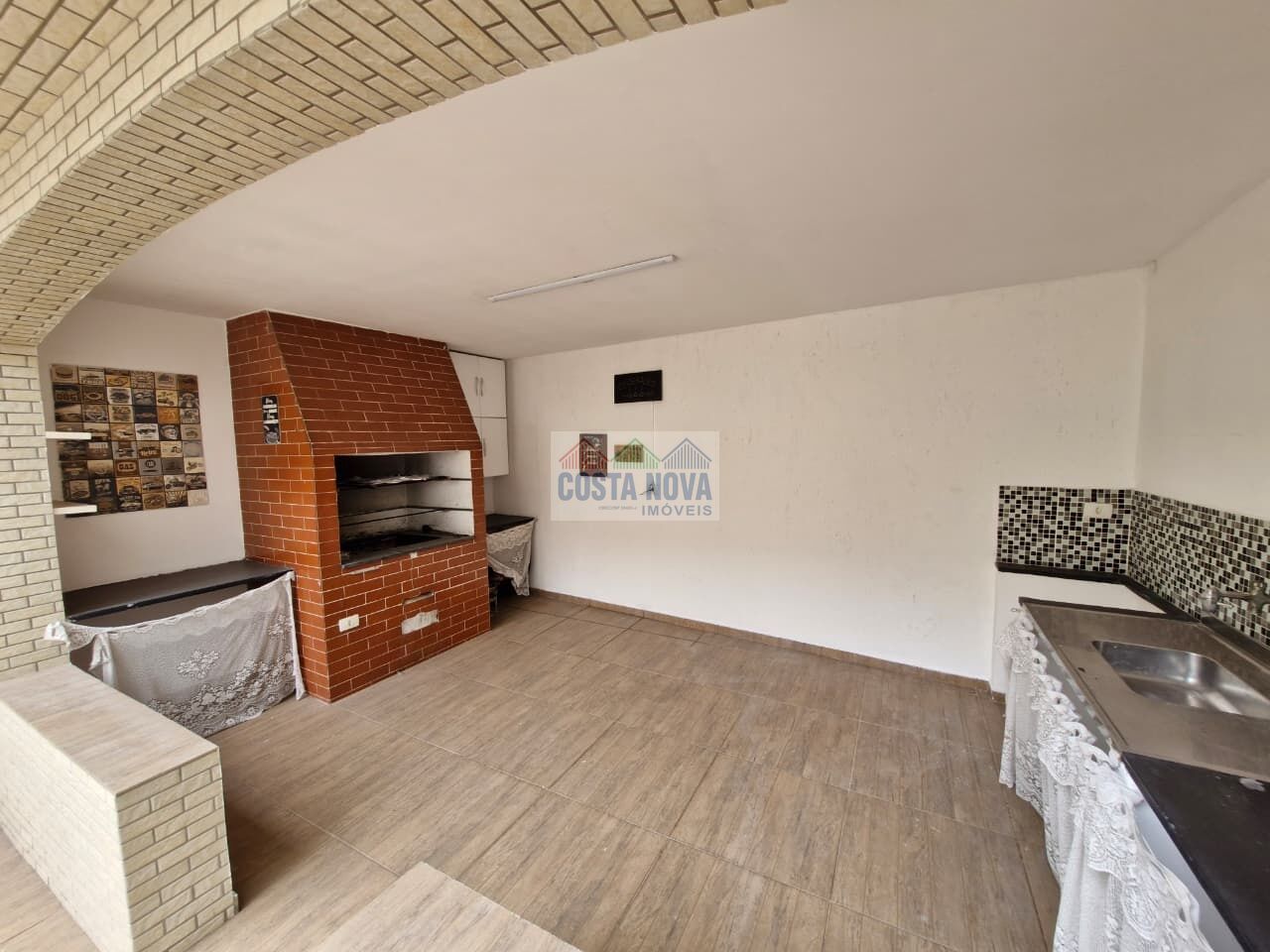 Espaço para festas coberto com churrasqueira e cozinha auxiliar.